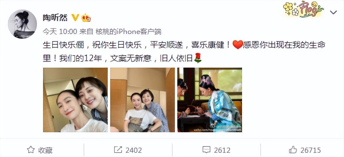 今年生日,邓超还没有给自家老婆送祝福,不过按照近来夫妻二人低调的画风看,超哥估计不会上线为孙俪庆生了。虽说暂时等不来超哥的祝福,但孙俪的好友陶昕然早早地就在自己的社交账号上发文为其庆生,她还感性写道:“感恩你出现在我的生命里,我们的12年,文案无新意,旧人依旧”,好戳人有木有。自从合作了《甄嬛传》后,孙俪和陶昕然便成为了好闺蜜,之后孙俪每一年生日,陶昕然几乎都会准时送祝福,闺蜜情深羡煞旁人。