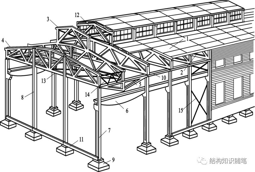 (1) 屋面:主要由各种屋面板材组成,平铺于屋架上,承受外荷载。