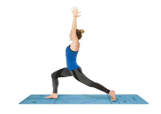 竖直站立,右脚向前跨一步,两腿伸直,重心放在两腿中间,呼气时,重心向右脚方向移动,同时右脚膝盖弯曲,左脚跟离地,双手伸直向上举起,吸气时还原;做10次,换侧练习。(也可以双手在头顶上方双手合十)