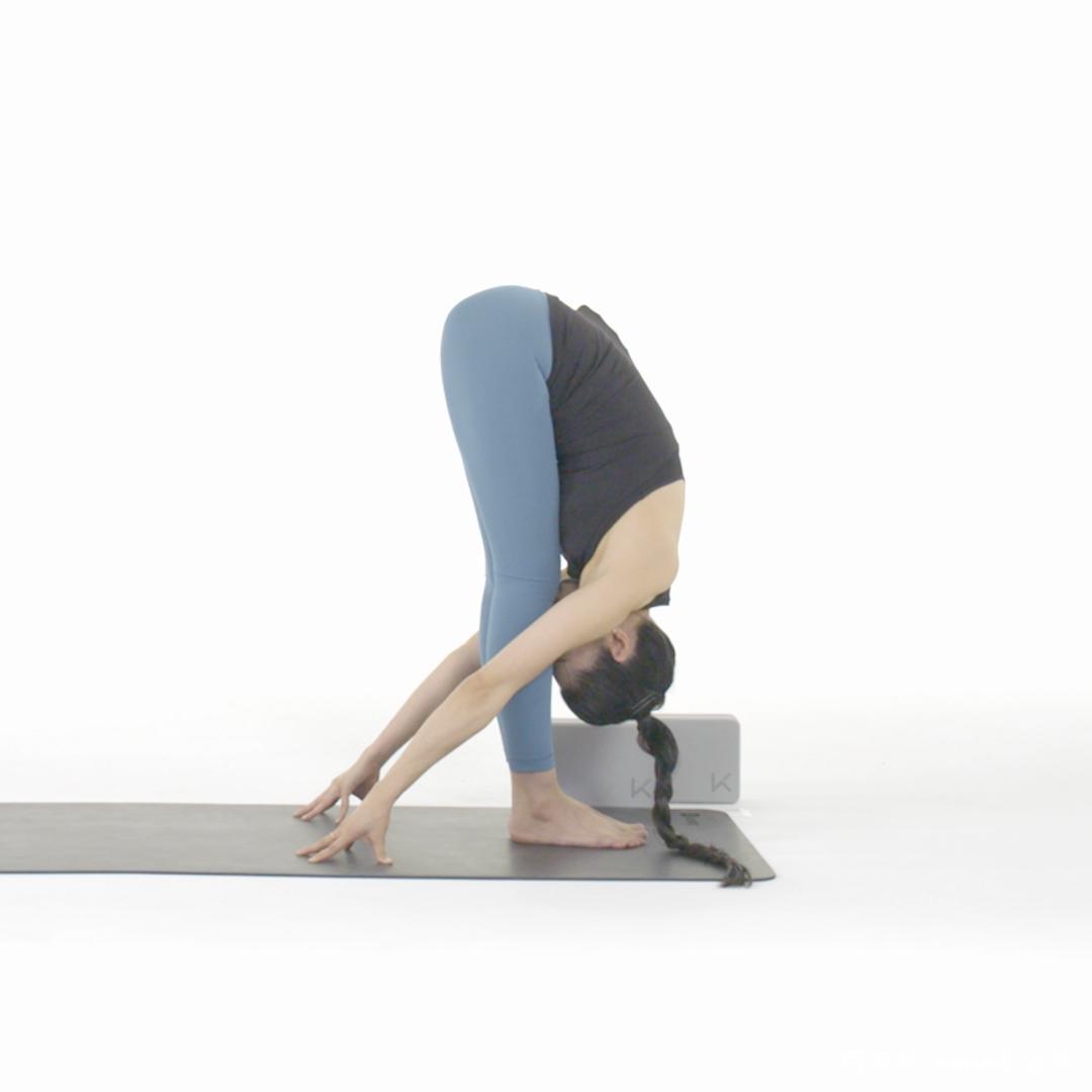 双脚并拢,竖直站立,腰腹部逐渐向下弯曲,尽量使腹部和胸部贴近大腿和小腿前侧,双手挺直放于双脚后方,手掌张开撑地,鼻尖贴紧小腿,保持10秒。