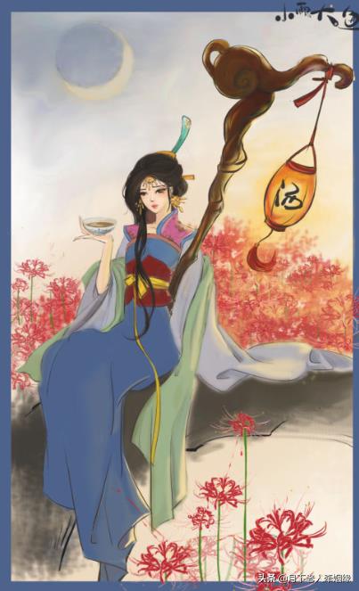 相传人死后魂魄到阴间报到要走很长一段路,这条路叫黄泉路,黄泉路上有一条河叫忘川,河上有一座桥叫奈何桥,走过奈何桥有一个土台叫望乡台,望乡台边有个老妇人在卖孟婆汤,忘川边有一块石头叫三生石,孟婆汤让你忘了一切,三生石记载着你的前世今生,我们走过奈何桥,在望乡台上看最后一眼人间,喝碗忘川水煮的孟婆汤。