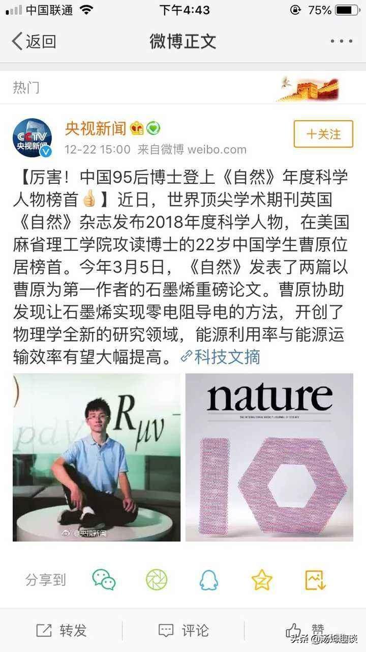 从2018年3月5日开始,曹原开挂的人生正式拉开帷幕。《自然》杂志上连续刊登了两篇,以曹原为第一作者的论文,主编甚至不惜为此打乱已经安排好的计划,提前加塞,把这两篇论文都发表出去。