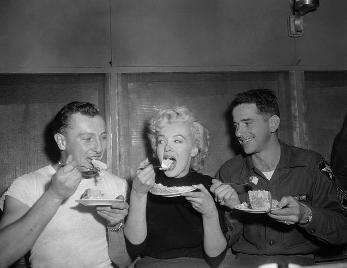 梦露保持了独一无二的倾城美颜,不仅要为总统演唱,还要慰问美国士兵。1954年玛丽莲·梦露飞到韩国进行为期4天的劳军活动,图中为玛丽莲梦露和驻韩士兵的合照,成为10万美军的“甜心女神”,整个美国步兵第三师陷入疯狂