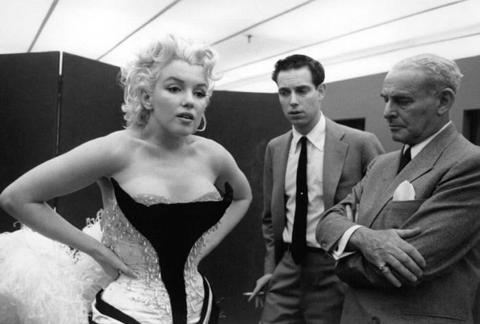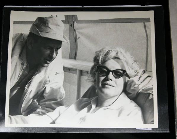 在这张照片中,玛丽莲微笑着站在那里,导演乔治·库科尔把项链系在她的脖子上。据玛丽莲的朋友兼邻居弗雷达·赫尔(Freda Hull)说,梦露在她最后一部电影《不般配》(the Miffits)的拍摄现场流产。但也有消息指出这是一场媒体闹剧,是制片厂的宣传炒作。
