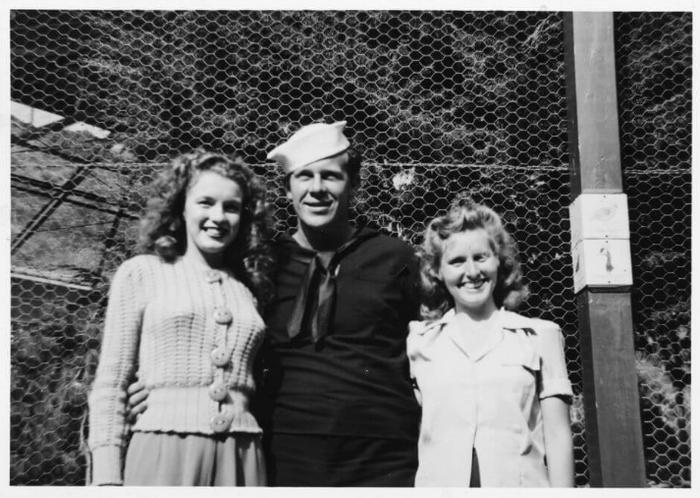 她高中辍学,决心成为一名家庭主妇,到工厂当起了拧螺丝的打工妹。这张照片摄于1943年,她与丈夫和一位朋友手挽手。