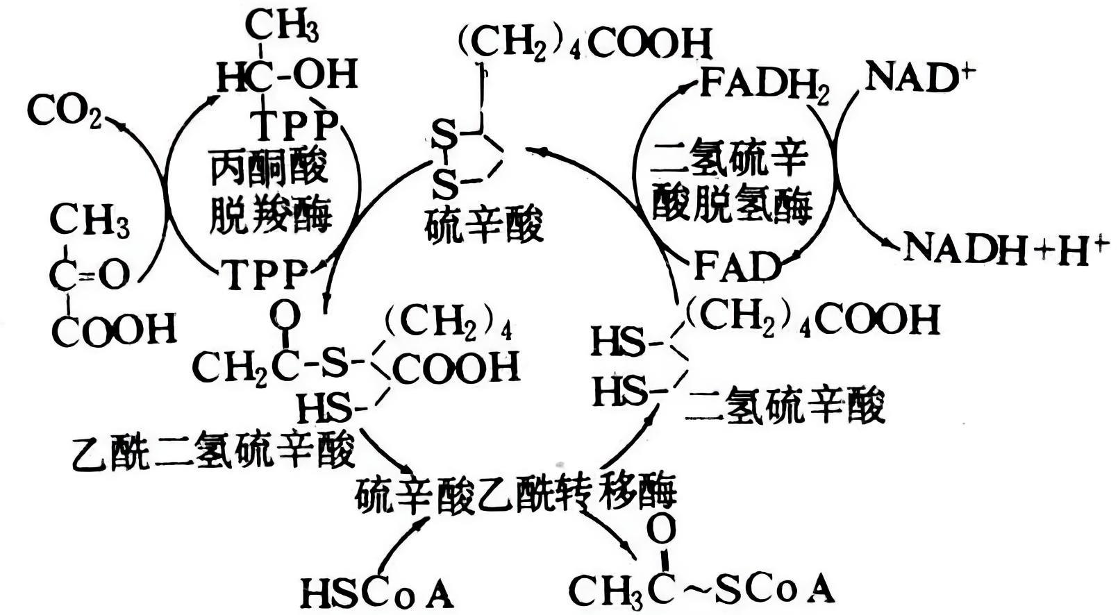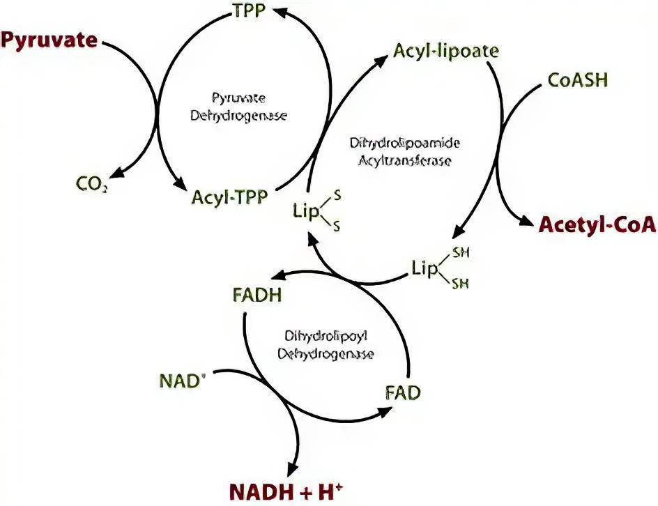 参与三羧酸循环。丙酮酸脱氢酶复合酶系催化的反应是三羧酸循环的重要步骤,使得食物中的碳水化合物、脂肪和蛋白质转化为能量,维持生物体的生命活动。