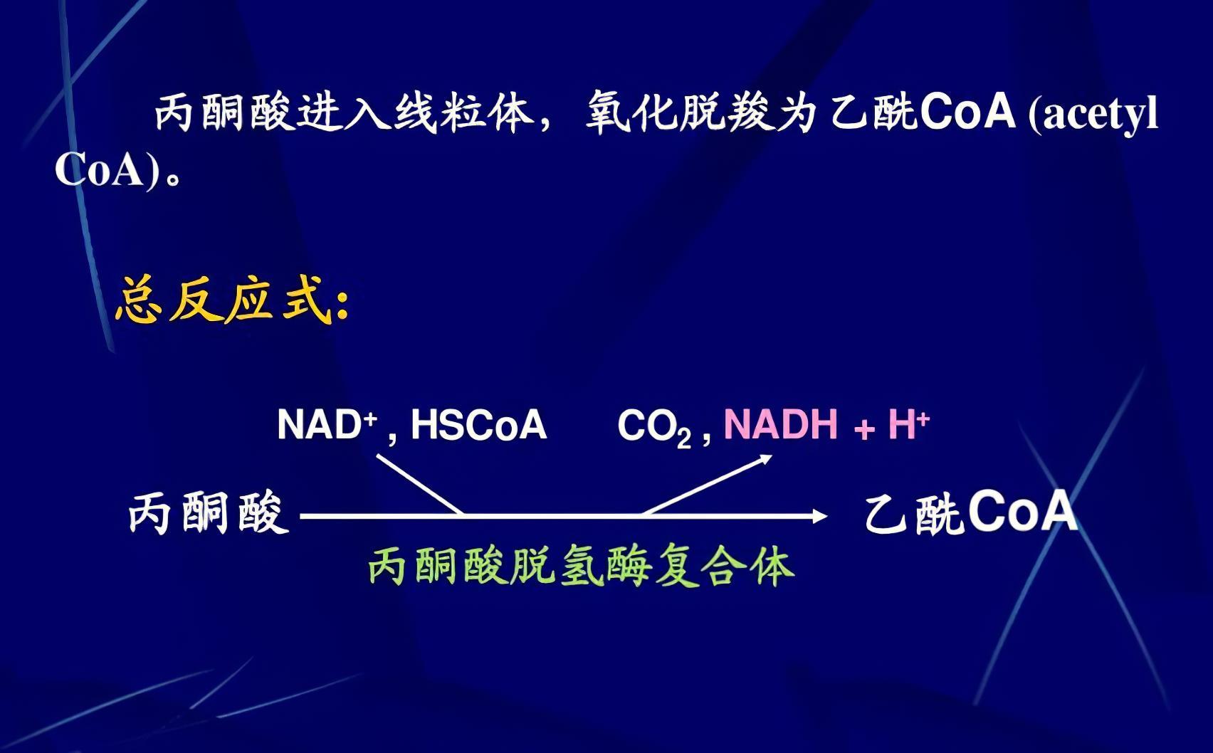 具体来说,丙酮酸首先经过丙酮酸脱氢酶的催化氧化为丙酰辅酶A,同时生成NADH;随后,磷酸乙酰转移酶将丙酰辅酶A转移出去,生成乙酰辅酶A和乙酸酯;最后,二氧化碳水合酶催化生成的二氧化碳与水反应,生成碳酸氢盐。