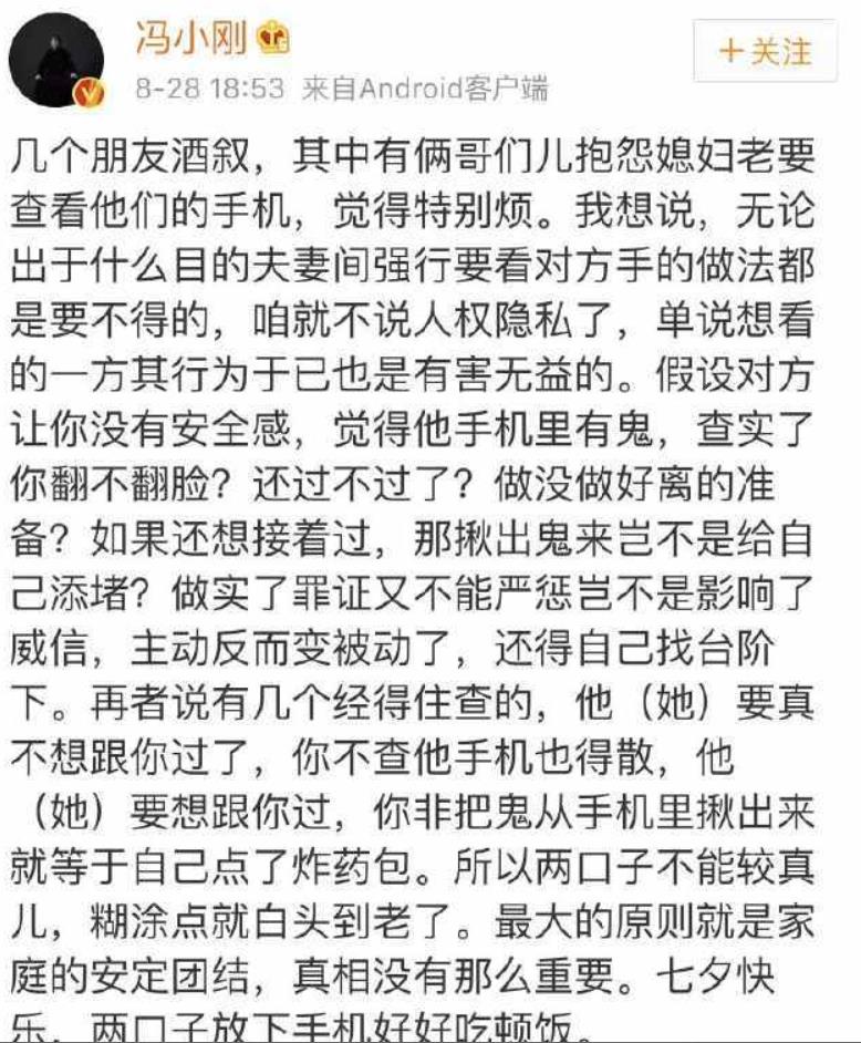 2017年,冯小刚聚餐后发表了”关于对方看自己手机”这一事情的看法。