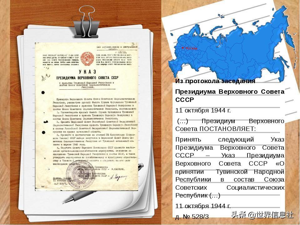 1944年10月,苏联官方将图瓦并入俄罗斯的法令