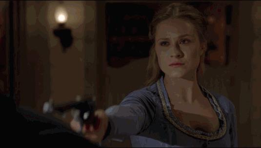 第一集的结尾,德洛丽丝完全觉醒,在酒会上一枪崩了创始人福特的脑袋,拉开人类与机器人之战的序幕。