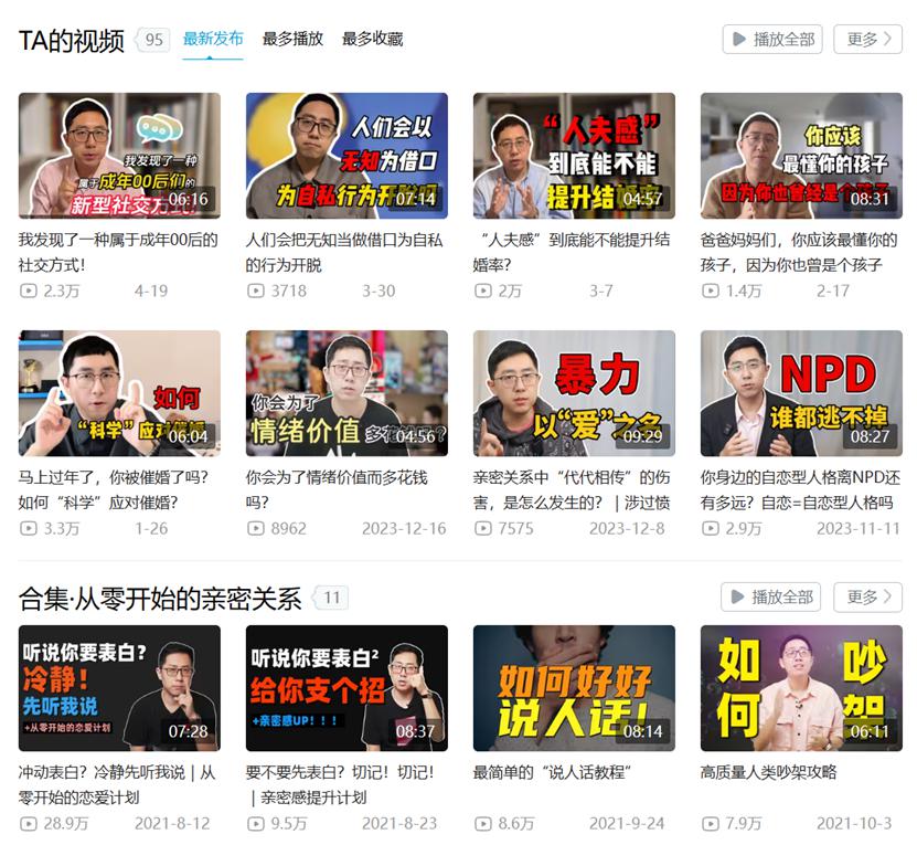 在这些视频收到的反馈里,我发现男孩们对于表白和分手挽回很在意,甚至还催生了很多分手挽回的生意——但我不提倡,它实际只是满足情绪价值,花钱后就不负责了。我发现,相比男生在意结果,女生更在意亲密关系的过程。