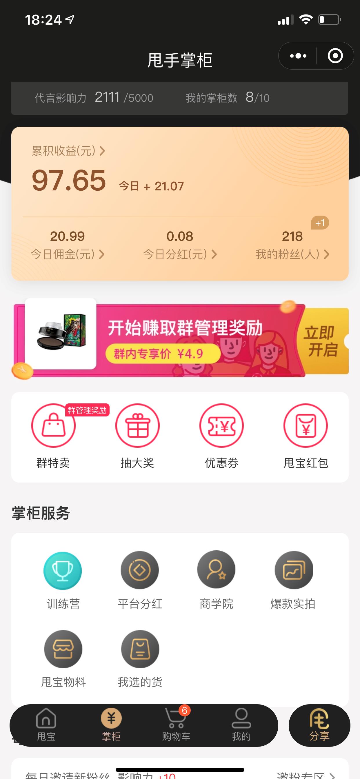 有感兴趣者邀请了十位朋友成为自己的粉丝后成功成为甩甩宝宝平台的掌柜,同时也看到了每件商品的具体返佣比例,比如,一台标价为3198元的vivo手机,该平台显示能赚取104.65元,返现3.27%。而一件标价为159的冠军运动衫,就可赚取19.9,返现约为12.5%;然后粉丝越多返现越多,当粉丝达到一定量后还有粉丝管理奖励,代言分红等,比购物返现要高得多,据了解,当粉丝数量达到数万甚至十万的时候,每天的代言费可分到几十到几百不等;