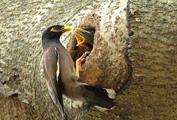 家八哥通常都成群或成一长排在树冠浓密的大树上筑巢,其选择的高度与树种也相似。