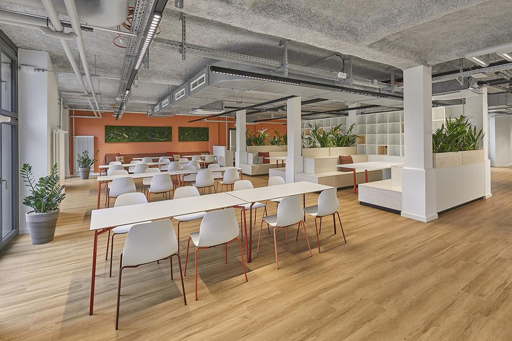 设计团队创建了一个体现最终用户需求的工作场所概念:工作站与众多社交互动和协作空间相结合的空间。这种形式的工作场所将在一个不断迭代的过程中自我重塑,并最终成为Babbel专属的独特办公环境。