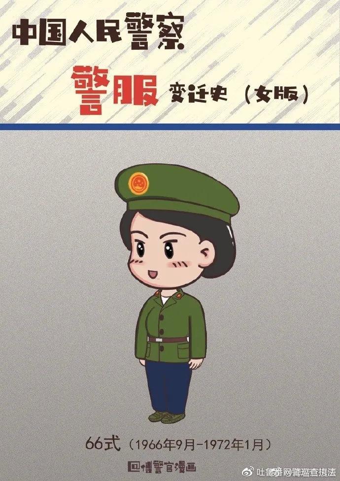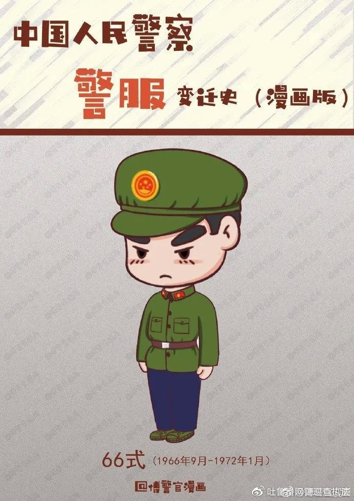 1966年7月2日,经国务院批准,全国公安民警实行新的服装制式,即“六六式”警服。警种服装的上衣为草绿色,下衣为藏蓝色,无红色裤线。取消原来女警服中的列宁服上衣和裙子。所有民警的服装样式全与解放军干部服装相同。帽徽为圆形,中心是国旗,国旗周围雕金色麦穗和齿轮。在所有警种中只有交警在夏季执勤时可以戴白色盔式帽,穿白色上衣(1967年又改为绿色),冬季可以穿黑色皮质短风衣。黄河以北地区的交警在冬季执勤时还可以穿马裤。