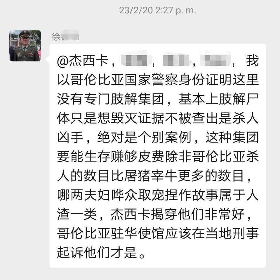 我们几天前也在哥伦比亚华侨微信群里分享了实锤侣行的视频。群里一位华裔哥伦比亚高级警官徐警长看后评论说:“我以哥伦比亚国家警察身份证明这里没有专门肢解(尸体的)集团 … 那两夫妇哗众取宠、捏作故事属于人渣一类,杰西卡揭穿他们非常好,哥伦比亚驻华使馆应该在当地刑事起诉他们才是”。群里华侨纷纷赞成徐警长的意见,强烈要求起诉侣行夫妇。