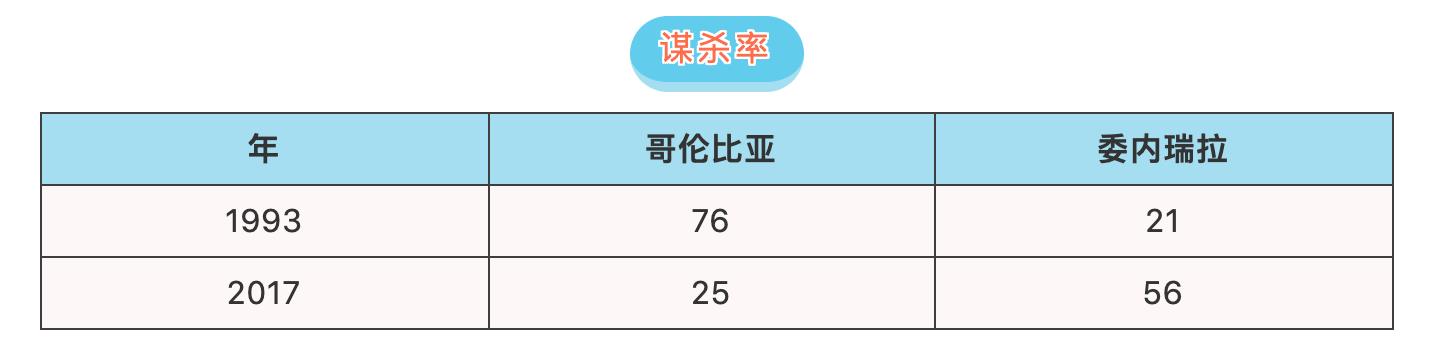 2017年哥伦比亚的谋杀率是25,世界排名第十八,哥伦比亚治安的确有显著的改善。邻国委内瑞拉的情况刚好相反,委内瑞拉2017年谋杀率是56,高居世界第三。1993年是21。