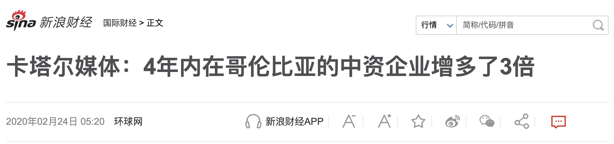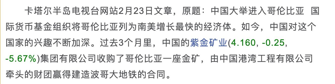 前几天卡塔尔半岛电视台报道:“中国大举进入哥伦比亚,4年内在哥伦比亚的中资企业增多了3倍,从20家增加到80余家。过去3个月里,中国的紫金矿业集团(花10亿美金)收购了哥伦比亚一座金矿,由中国港湾工程有限公司牵头的财团赢得建造波哥大地铁的合同。”