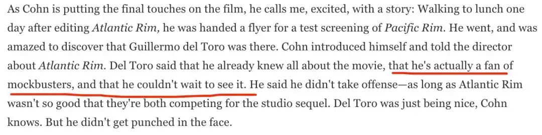 据GQ采访,《环大西洋》在拍摄时,正版《环太平洋》导演陀螺都曾亲自上门拜访,说自己“是个粉丝,迫不及待想看到《环大西洋》。”