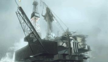紧接着,怪兽出现了,它毁灭了潜艇,毁灭了钻井平台。