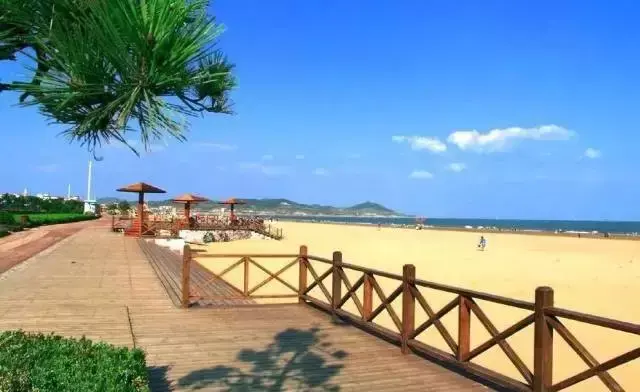 坡缓水洁,沙质细柔,夏季中午海水水温为25左右,是我国最优良的天然海水浴场之一,素有"北方第一海滩"之称。沙滩长10000米、宽60-180米,沙砾幼细,色泽金黄,面积广大,坡度平缓,又称万米金沙滩,这里是进行日光浴、沙滩排球等沙上运动的极佳之地。