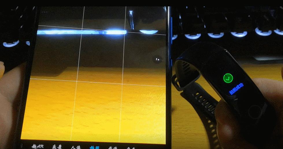 荣耀手环4在连接蓝牙的情况下可以控制手机进行拍摄,相当于多了一个无限自拍装置,如果你只有一个有线的自拍杆,那么有了荣耀手环4以后就可以升级原来的自拍杆为无线自拍杆,通过手环快速进行拍照。手环中控制手机拍摄的界面会在手机相机开启时自动跳出,是一个照相机的图标,在相机退出后,这个界面会自动消失,当然我们可以手动让它消失。GIF中相机画面一闪可以观察到拍摄已经成功。