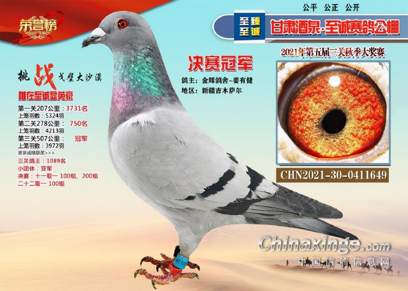 甘肃酒泉至诚赛鸽公棚2021年第五届三关秋季赛,今年赛线沿途多为戈壁沙漠地带,赛鸽战将们需要跨越风沙,不畏艰难困阻。本届比赛资格赛归巢率接近九成,热身赛归巢率接近八成,预赛归巢率超九成,决赛归巢率超五成,关关冠军分速均在1322米/分之上,最高1683米/分。金辉鸽舍-姜有健的2021300411649灰鸽力压群雄,以1322.6974米/分拿下今年比赛的总冠军的荣耀,同时获得小团体亚军的成绩。