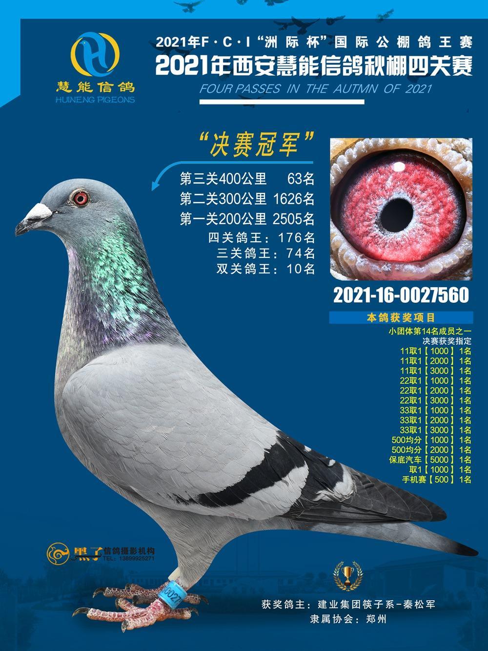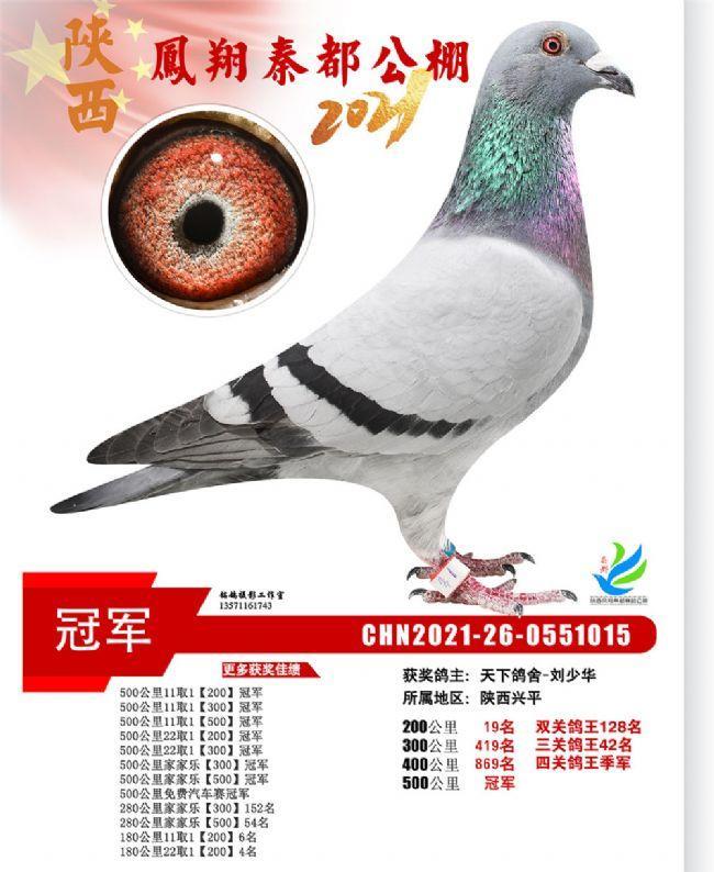 2021年陕西凤翔秦都赛鸽公棚第七届秋赛设四关竞赛,分别是200公里、300公里、400公里、500公里四关,经过四关大战,冠军名花有主。在终极决战中,4023羽赛鸽展开较量,天下鸽舍-刘少华的一羽2021260551015灰鸽捷足先登,凭借1148.9683米/分的成绩夺得本届比赛冠军,赢下决赛8项指定冠军,包括汽车一辆。同时凭借四关19名、419名、869名、1名的战绩,夺得四关鸽王季军。