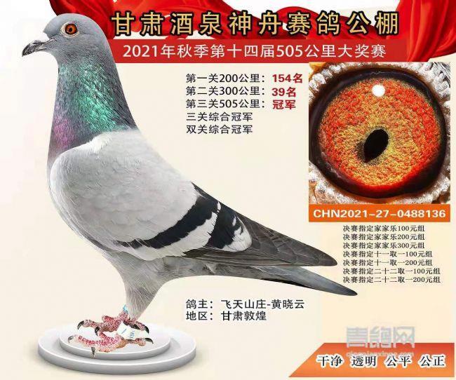 甘肃酒泉神舟赛鸽公棚今年已是第十四届赛事,比赛设180公里热身赛、280公里预赛、500公里决赛。决赛的赛线为内蒙古塔木素-甘肃酒泉,其地形复杂多变,有一定难度,对赛鸽具有极大的挑战性。来自甘肃敦煌的鸽友飞天山庄-黄晓云一举夺冠,他的一羽2021-27-0488136灰色爱鸽首关飞出154名,二关飞出39名,决赛拿下冠军,稳中带快,最终将双关综合冠军、三关综合冠军悉数揽入手中。