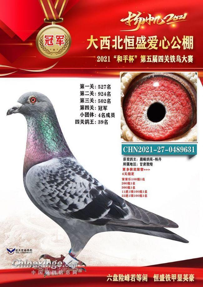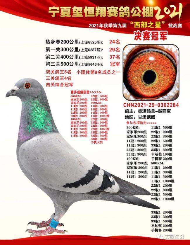 2021宁夏玺恒翔赛鸽公棚第九届“西部之星”公棚挑战赛,历经热身赛、三关正赛、加战赛,累计飞行距离超过1900公里。甘肃武威的鸽友睿泽鸽舍-赵丽军成为本届比赛的最大赢家,他的一羽2021-29-0362284灰鸽在500公里决赛险胜,领先第二名0.7秒钟夺得冠军,分速1236.057米/分,此外,这羽冠军鸽可谓关关猛、站站快,热身赛、三关赛每关均在50名以内,四站分别飞出24名、29名、37名、冠军,荣获双关鸽王5名、三关鸽王4名、四关综合冠军,累计斩获20多项指定大奖。