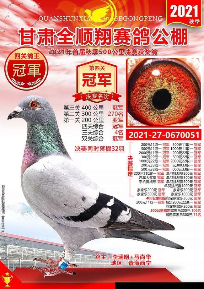 挑战经典西线,四关鸽王争霸。甘肃全顺翔赛鸽公棚2021年秋赛战得精彩,虽然赛线难,但是公棚赛鸽不畏艰险。八千多羽赛鸽从速度赛、四关赛,一路打到580公里加战赛,累计飞行空距超过2100公里。500公里决赛司放张掖,李涵明+马尚华的一羽2021-27-0670051灰鸽捷足先登,领先第二名1分钟归巢,分速1407.031米/分拿下决赛冠军。这羽赛鸽的佳绩还远不止此!在第一关,这羽战将就表现出惊人实力,夺下首关冠军。第三关、第四关连续发力,两度拿下冠军宝座!最终一举拿下双关综合冠军、三关综合四名、四关综合冠军,强势包揽超多指定冠军大奖!