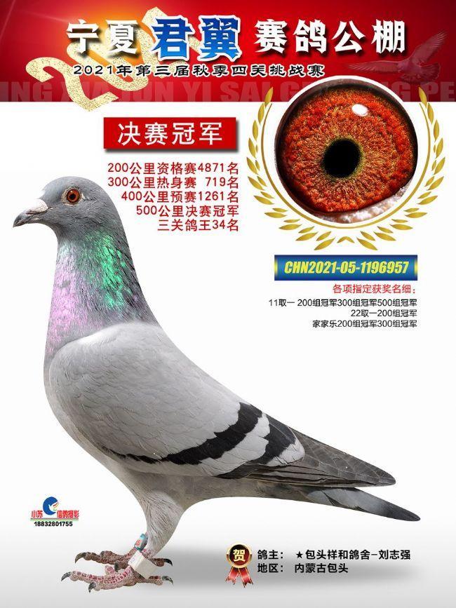 收鸽11990羽,大战四关,两度加战,宁夏君翼赛鸽公棚2021年秋赛可谓赛得过瘾!经过一系列的家飞训放锻炼后,100公里收费站当即拿下超96%归巢率的开门红战绩!10月16日,正赛开启,从第一关8327羽上笼,到第四关决赛仍有5660羽赛鸽,前三关发挥稳定,归巢率均超七成,第二关300公里更是飞出1607.4411米/分的高分速。决赛500公里难度加大,包头祥和鸽舍-刘志强的2021051196957灰鸽捷足先登,领先第二名4分钟归巢,凭借1220.3278米/分的成绩夺下冠军,并揽获6项指定冠军大奖。