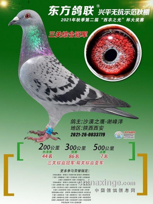 “三公”是生命线,“无抗”是保护神,东方鸽联兴平无抗示范秋棚,致力于打造陕西首家无抗养鸽示范秋棚,2021年秋季“西农之光”杯大奖赛鏖战三关,再加战两关。在最关键的决战中,张强的一羽2021-26-0407217灰雌鸽抢先报进,凭借1259.1984米/分的成绩逆袭夺下决赛冠军。沙漠之鹰-谢峰洋的一羽2021-26-0033779雨点雌鸽则关关猛,三关均进入百名之列,分别取得44名、86名、7名,最终拿下双关综合亚军、三关综合冠军。