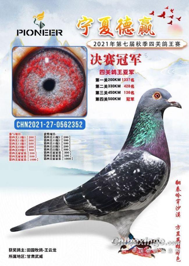 老品牌四关鸽王赛独树一帜,六关三越秦岭打造铁血战鸽!宁夏德赢赛鸽秋棚2021年打了四关正赛,又加战两场,尽显英雄本色!在决赛中,4161羽德赢战鸽从陕西洛南县启程,越秦岭穿沙漠,快速归巢。甘肃武威田园牧鸽-王云龙27-0562352雨点鸽率先入棚,以1135.6669米/分的分速夺得决赛冠军,同时赢得多项指定冠军、综合四关鸽王亚军。这羽赛鸽可谓步步为营,一路飞升,从首关千名开外,到二关500名之内,再到三关136名,最终决赛一战成名一举夺冠!