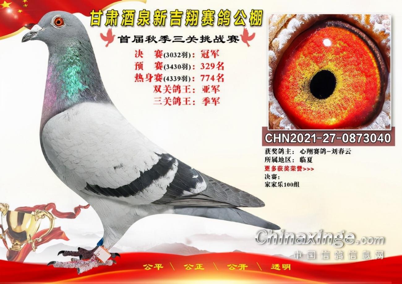 甘肃酒泉新吉翔赛鸽公棚2021年首届秋季三关挑战赛收鸽5611羽,累计训放16站,最远达到160公里。虽然是首届,公棚前两关比赛稳扎稳打,到决赛仍有三千羽战将上笼,但这一关危机四伏,赛鸽们出征武威,沿途赛线艰难,给决杀关带来巨大难度。最终心翔赛鸽-刘春云的一羽2021270873040灰鸽顶住压力,登上决赛冠军宝座,分速1039.202米/分,他的这羽赛鸽从首关700多名,到二关300多名,再到一举夺冠,越飞越快,同时拿下双关鸽王亚军、三关鸽王季军。