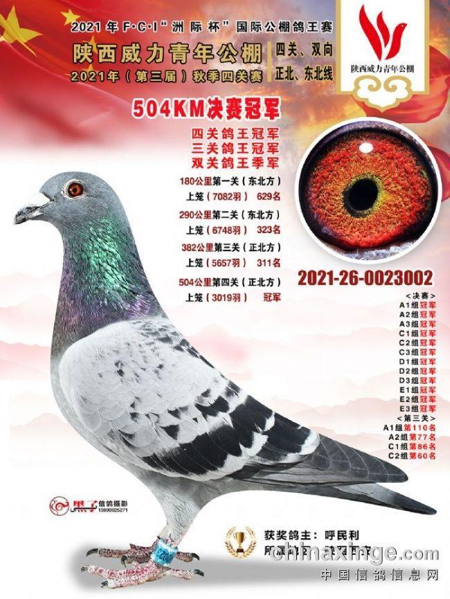 陕西威力青年公棚2021年第三届秋季四关双向大奖赛难度满满,资格赛11984羽起站,前两关为东北向,后两关为正北向,经过三关大战后,开启终极决赛比拼。雪域草原狼烟起,第四关504公里决赛在内蒙古鄂尔多斯开笼,气温低,难度大。3019羽威力勇士犹如一群威风凛凛守护蓝天的勇士。经过7个小时的鏖战,冠军决出。呼民利26-0023002雨点鸽以1223.5097米分速夺得冠军,此外,这羽赛鸽还凭借四关629名、323名、311名、1名的战绩,拿下双关鸽王季军、三关鸽王冠军、四关鸽王冠军及多项插足指定冠军,堪称大赢家。