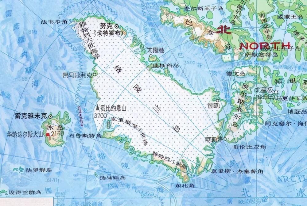 格陵兰岛位于北美洲东北部、北冰洋与大西洋之间,西面隔巴芬湾、戴维斯海峡与加拿大的巴芬岛等岛相望,北部濒临北冰洋,南部濒临大西洋,东边隔丹麦海峡与欧洲的冰岛对望;从该岛最南端的法韦尔角到最北端的皮里地(杰塞普角)相距2500多千米,东西最宽处1290千米,面积216.63万平方千米,约是我国台湾岛面积近60倍,是世界第一大岛。格陵兰岛约3/4土地在北极圈以北,最北端的杰塞普角已达北纬83.6度。格陵兰岛的海岸线弯曲漫长,总长35000千米,与澳大利亚大陆的海岸线长度相当;有许多深入陆地的巨大峡湾,世界最长的峡湾(长约320千米)就在该岛的东海岸。格陵兰岛的东面是面积120万平方千米的格陵兰海,位于格陵兰岛、扬马延岛、冰岛和斯瓦尔巴群岛之间,是北冰洋海水向大西洋流动的主要通道,寒冷的东格陵兰寒流流经,有丰富的海豹、海象、鲸、海豚、鳕鱼、鲱鱼、红大马哈鱼、大比目鱼等海洋生物。格陵兰岛西面的巴芬湾是一个位于大西洋和北冰洋之间的海,是大西洋西北部在格陵兰岛与巴芬岛之间的延伸部分,南北狭长1450千米,面积69万平方千米,海洋生物有磷虾、大比目鱼、鳕鱼、海豹、海象、一角鲸、白鲸等。戴维斯海峡在巴芬湾的南部,格陵兰岛与巴芬岛之间,南接拉布拉多海,北连巴芬湾,南北长650千米,东西宽320~450千米,是西格陵兰暖流的主要通道。格陵兰岛与加拿大的埃尔斯米尔岛之间的史密斯海峡沟通了巴芬湾与北冰洋,十分狭长,最窄处不足20千米。