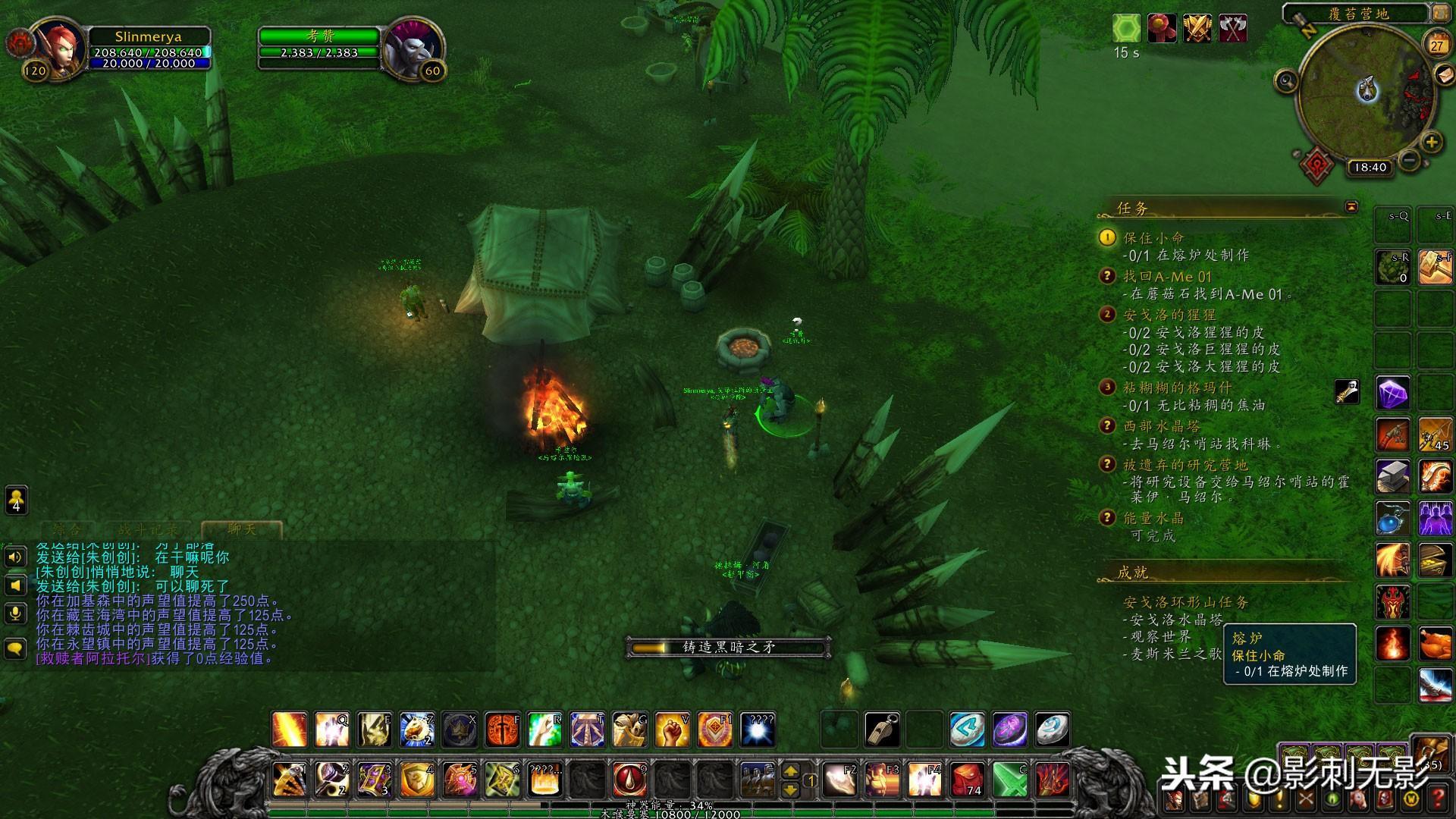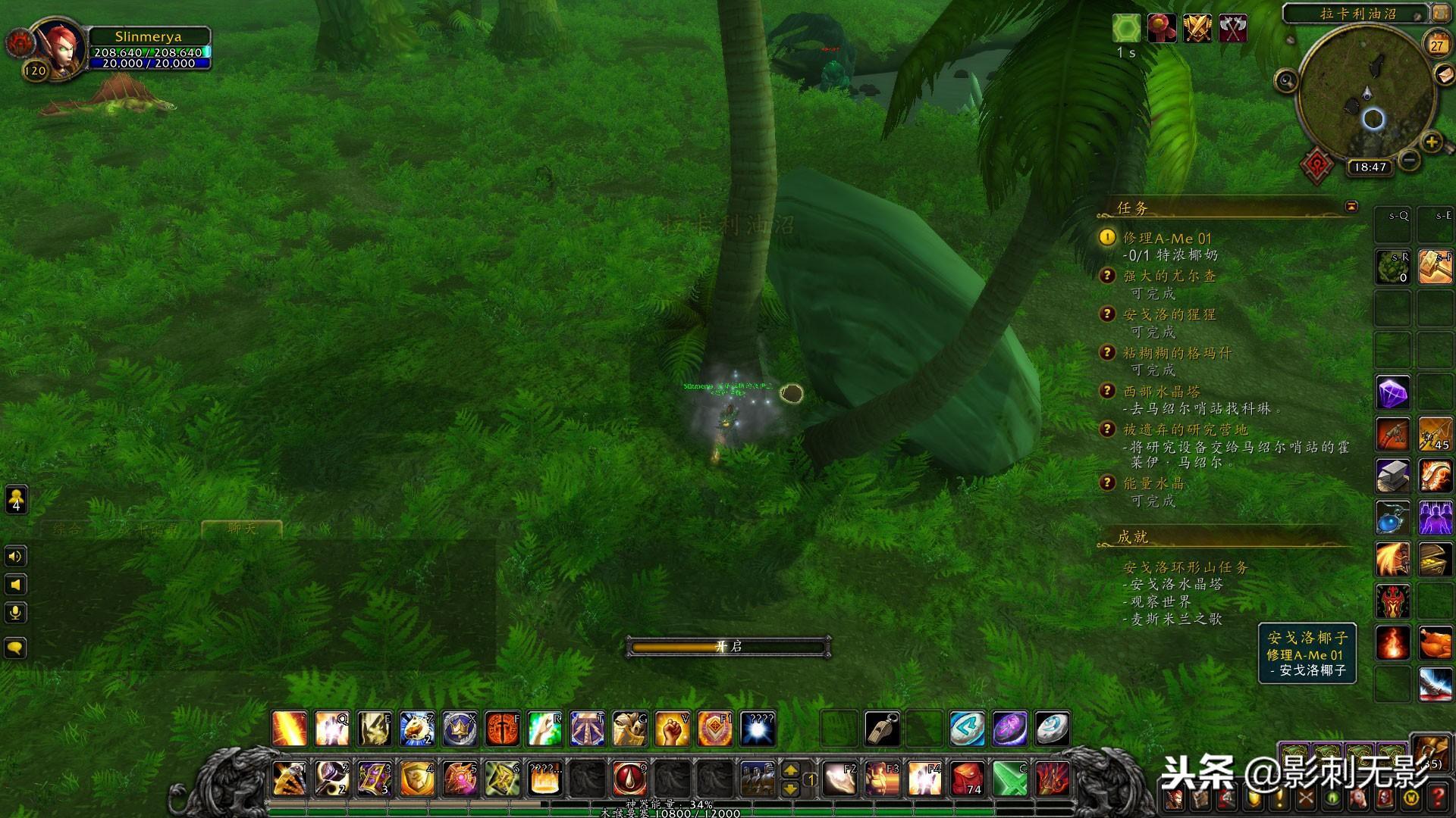 7,先把覆苔营地的任务交了,在营地点击炉火锻造黑暗之矛,完成后得到图纸,属性还不错啊,然后去蘑菇石,路上顺便把格玛什打了刮油=。=,在蘑菇石打三种不同的猩猩皮,进山洞后接到任务打尤尔查的皮,在洞里找到后打掉,完成任务出来在蘑菇石附近找到A-Me 01,找到后这个机器人已经被蹂躏的不行了,我们需要在附近的椰树下找到椰果,在机器人旁边的岩石附近砸开,点击拾取椰汁,跟机器人交任务,然后回去交任务,都交完后我们去北部水晶塔,完成后去马绍尔哨站