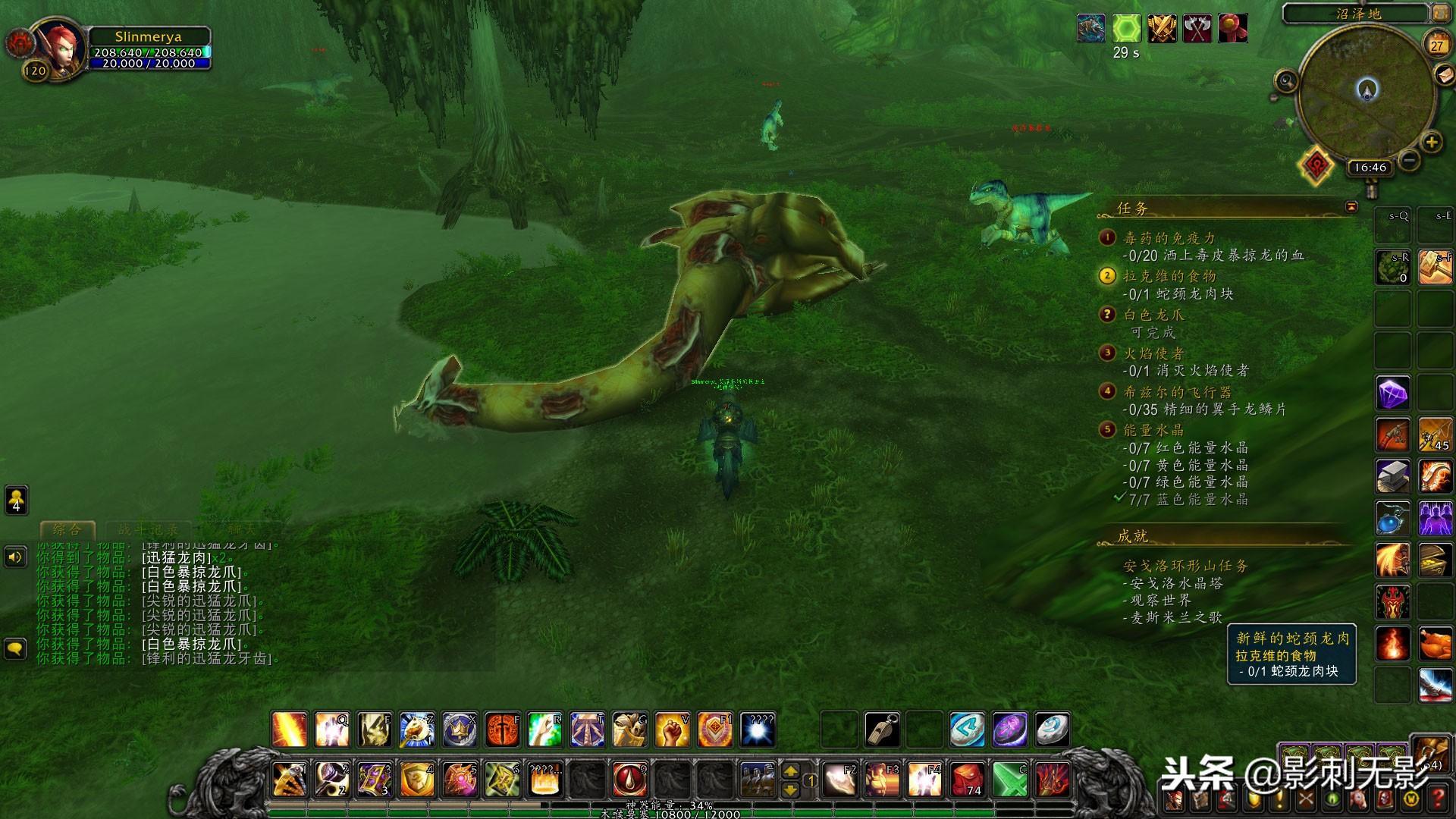 2,到营地交完任务后接到后续任务,不过我们先去寻找暴风爪,找到他后接了附近的任务,我们先做白色龙爪的任务,附近的暴掠龙都掉,完成后在附近一个蛇颈龙尸体,拾取一个肉块,然后去找毒皮暴掠龙,大号做这个任务是真的难啊,任务机制是需要打那个龙才会出血,大号脱光虚弱复活也不行,我是运气好组了个小术士,我来着怪,他用武器平A才出血,后来小术士下线了,我就自己试了试,脱光虚弱后一拳打不死龙的,我就先打一拳不出血的话就脱战再找这个龙,还可以,最后还是在小术士的带领下完成了,感谢他来自狂热之刃的黯然销魂术