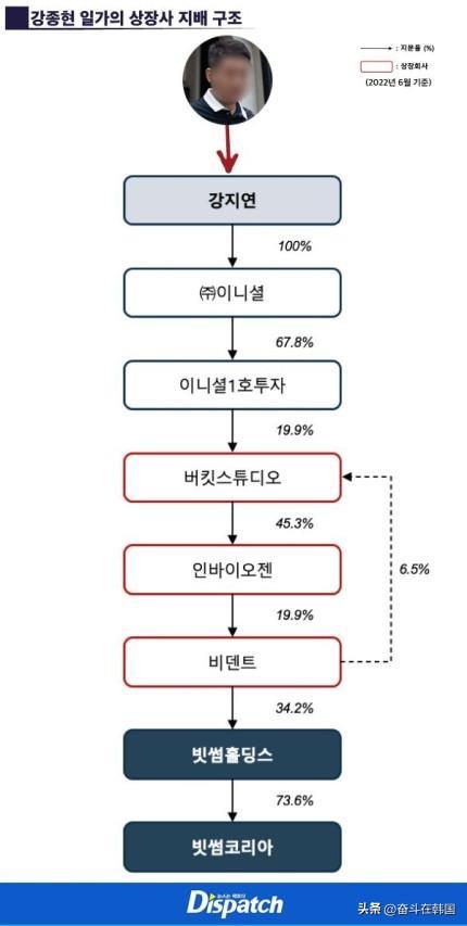 他有三家公司名义上的代表都是妹妹姜智妍(音),但是他的名片上写着“Vidente、Inviogen、Bucket Studio、Bithumb Live会长”,其中Vidente和Bucket Studio是KOSDAQ上市公司,Inviogen是KOSPI上市公司(注:KOSDAQ和KOSPI都是韩国证券交易所)。