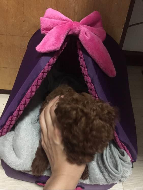 因为是突然决定买的!谁能想到出去买个菜!结果菜没买,买个小可爱回来, 马上在网上给它各种买啊!shopping啊!这下好了网购看的全是狗狗的东西! 下面这个小窝两用的!可是小篷子不弄掉她不愿意待里面,可能害怕!胆子小小的!
