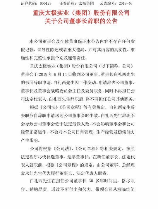 6月18日,太极集团在官网发布公告:重庆太极实业(集团)股份有限公司(以下简称:公司) 董事会于 2019 年 6 月 14 日收到公司董事、董事长白礼西先生 的书面辞职申请。白礼西先生因工作变动,申请辞去公司董事、 董事长及董事会战略委员会主任及委员职务,同时不再担任公 司法定代表人,白礼西先生辞职后,将不再担任公司其他职务。