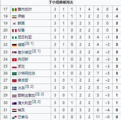 而在小组赛阶段就被淘汰出局的16支球队里,当属卫冕冠军德国最为尴尬,不仅创造了队史世界杯的最差战绩,而且才以3分排在第22名,落后于塞内加尔、伊朗、韩国、秘鲁、尼日利亚等五支球队。