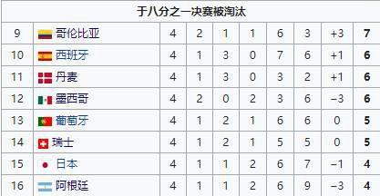 止步16强淘汰赛的8支球队,最终排名由第9名至第16名,分别是哥伦比亚、西班牙、丹麦、墨西哥、葡萄牙、瑞士、日本、阿根廷。