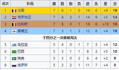 世界杯第1名当然是夺得冠军的法国,而第2名也没有任何的疑问,就是历史上第一次打进决赛却屈居亚军的克罗地亚。而在三四名决赛上,比利时击败了英格兰,所以比利时排在第3名,而英格兰排在第4名。