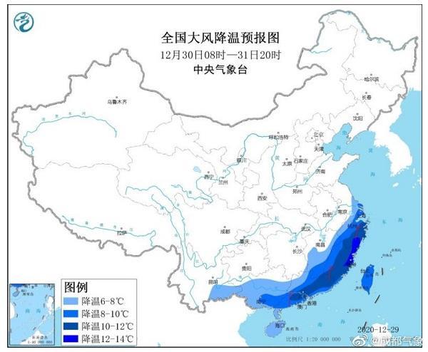 12月30日-31日全国大风降温预报图(图源中央气象台)