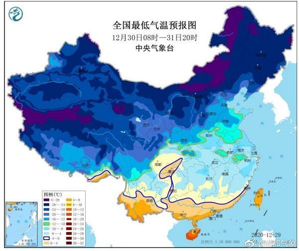 12月30日-31日全国最低气温预报图(图源中央气象台)