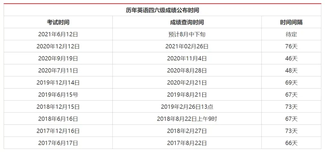 所以预估本次成绩出分时间为在2月21~25日左右,大家也可以参考一下2019年以及之前四六级出分时间(2020年受疫情影响,共有7月、9月、12月三场考试,所以参考性不强)。