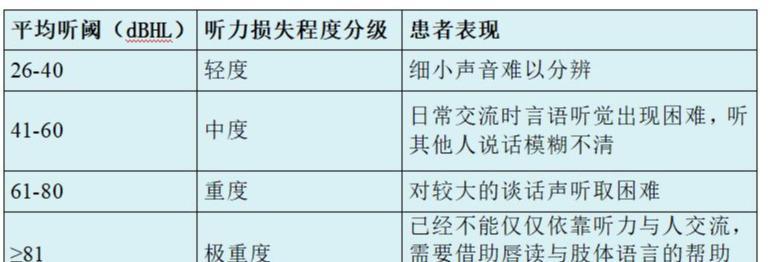 根据WHO组织1997年发布的标准,可根据纯音听阈测定结果(500、1000、2000、4000Hz的平均听阈)将听力损失程度分为轻、中、重、极重度四种程度,如下表所示。