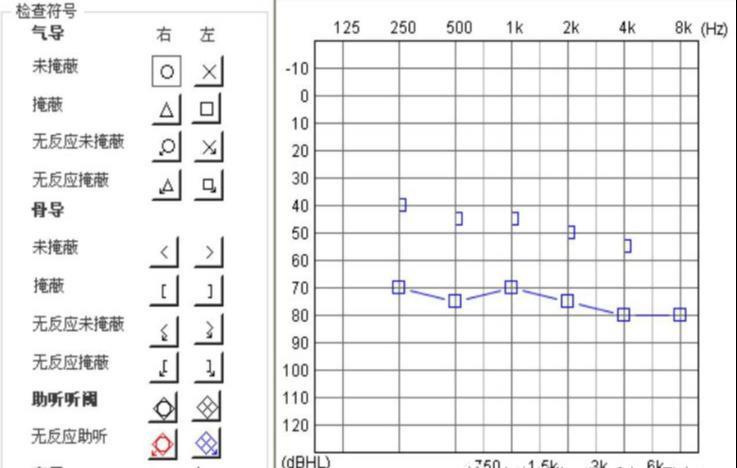 首先听力图使用红蓝两个颜色做标记。红色标记代表右耳的结果,蓝色标记代表左耳的结果。
